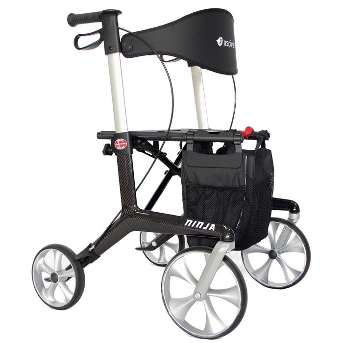 The Aspire Ninja is a lightweight seat walker designed for everyday use. Made from carbon fibre, it’s easy to lift in and out of a car and has large front wheels for greater mobility outdoors.