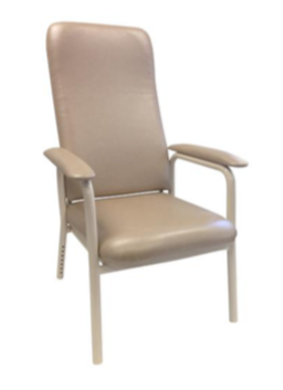The High Back Chair features a contoured backrest, padded armrests, vinyl upholstery, adjustable height, and a powder coated steel frame. Available in Teal/Blue and Mocha.