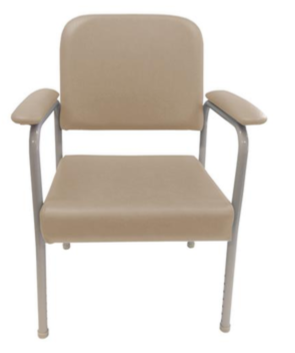 The Standard Utility Chair features a contoured backrest, padded armrests, vinyl upholstery, adjustable height, and a powder coated steel frame. Available in Teal/Blue and Mocha.